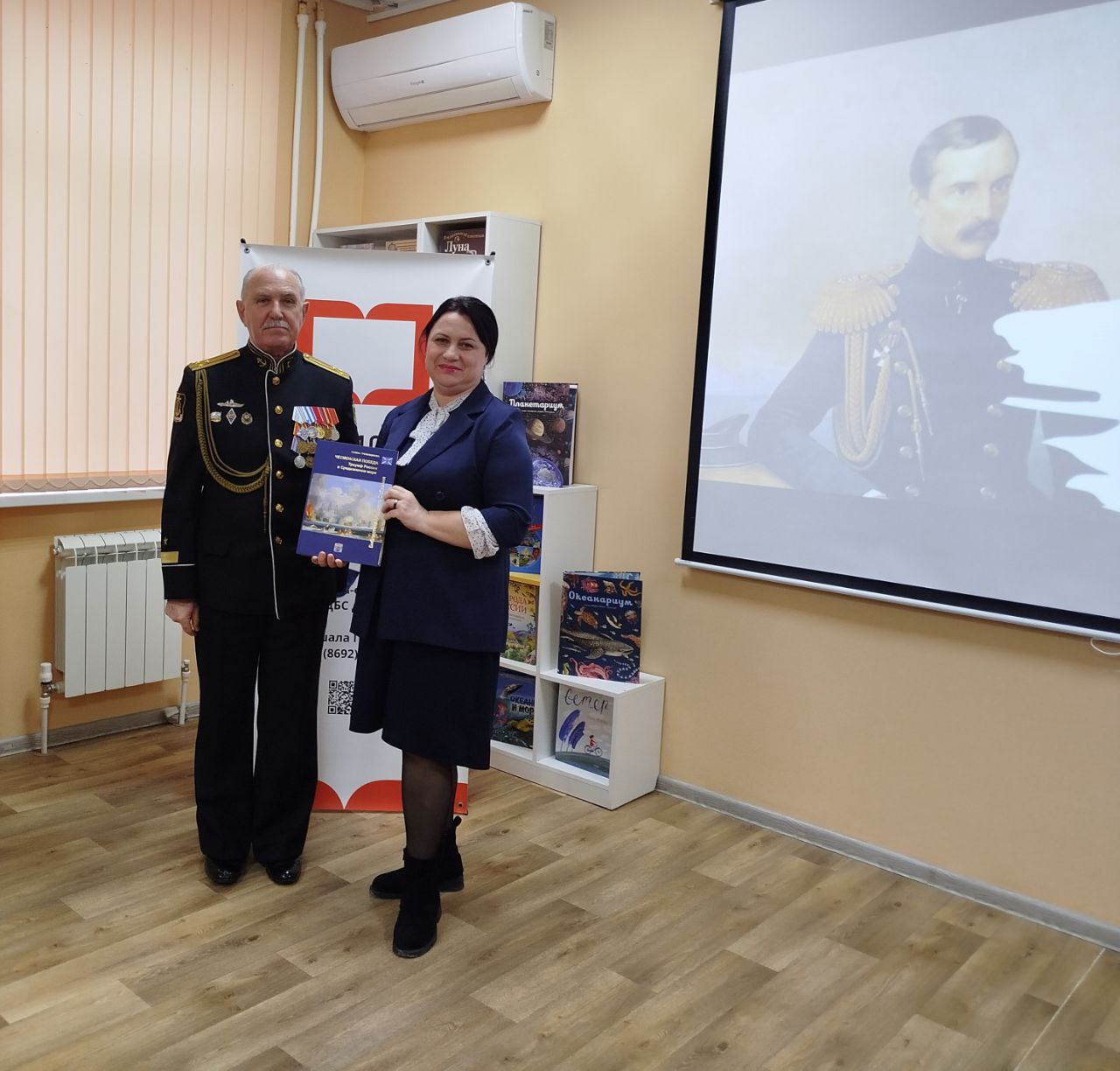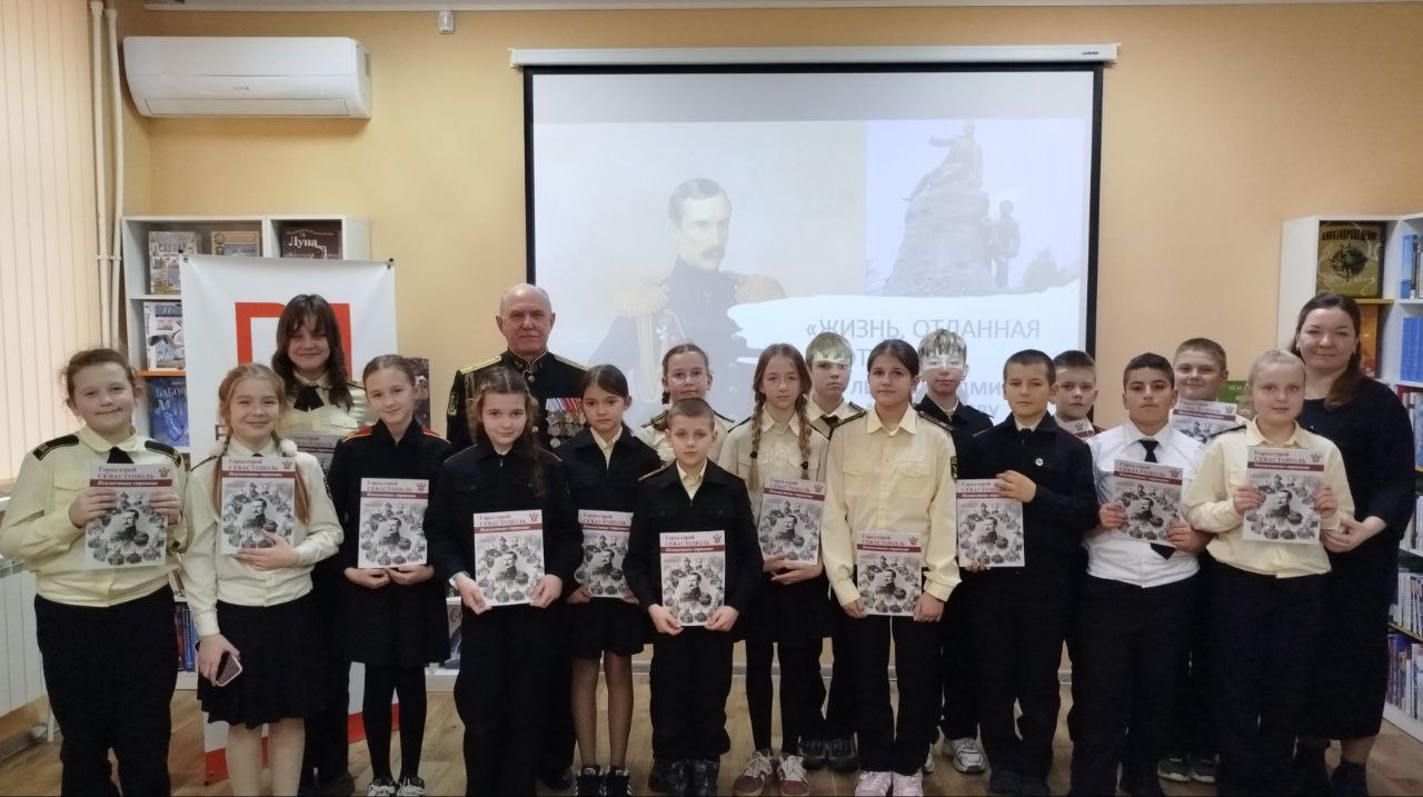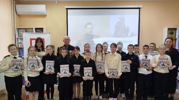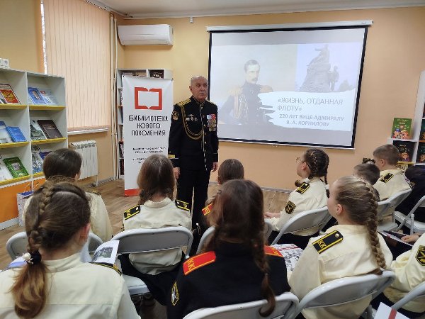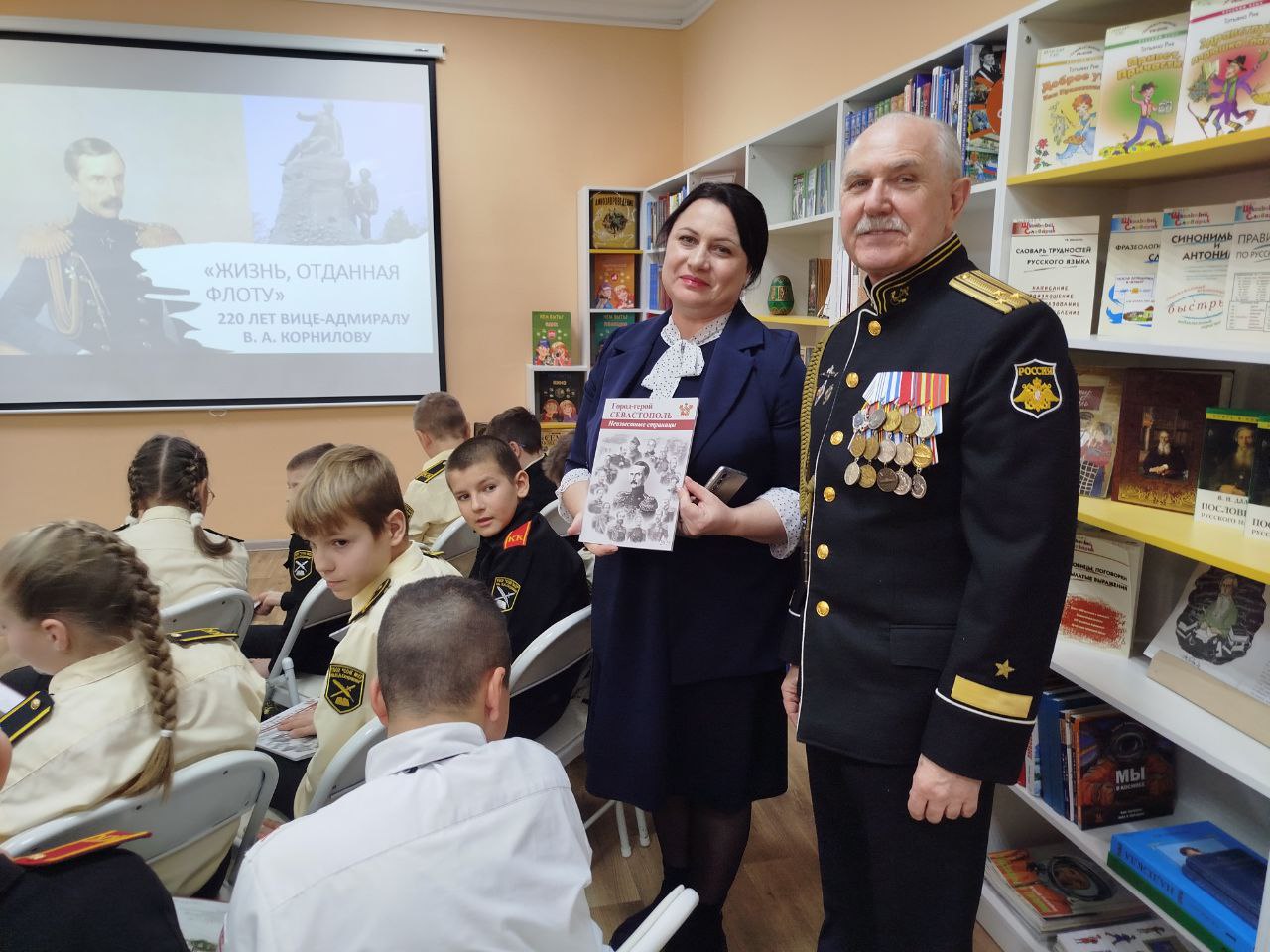 Председатель Севастопольского Морского Собрания В. Пискайкин встретился с кадетами кадетского класса школы № 22 г. Севастополя в библиотеке-филиале № 13 Централизованной библиотечной системе для детей г. Севастополяна на тематическом мероприятии "Честь и верность. Вице-адмирал Корнилов В.А.", посвященном 220-й годовщине со дня рождения флотоводца.