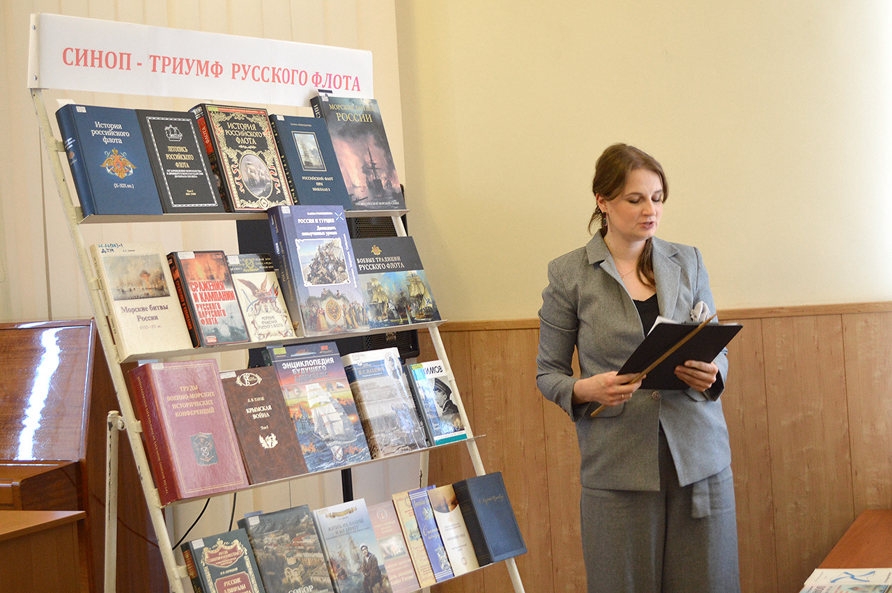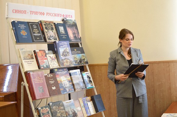 Продолжил Синопские чтения обзор литературы из фондов Морской библиотеки о Синопском сражении и адмирале П.С.Нахимовым, который провела библиотекарь О.В.Качановская. Курсанты Черноморского ВВМУ им. П.С. Нахимова и юные участники чтений впервые увидели удивительные книги разных лет, посвященные Синопской Победе и теперь знают о чём спрашивать в Морской библиотеке.