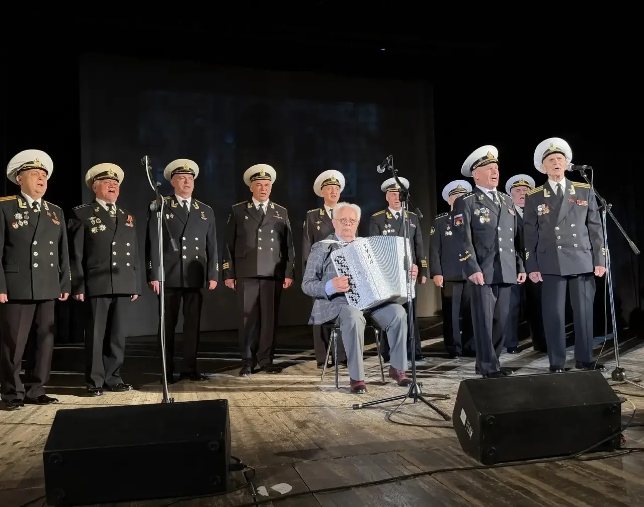 Заслуженный коллектив народного творчества Российской федерации ансамбль ветеранов флота "Морская душа" принял активное участие с песнями "В Кронштадтской гавани", "По морям по волнам", "Ходили мы походами", "Песня о тревожной молодости".