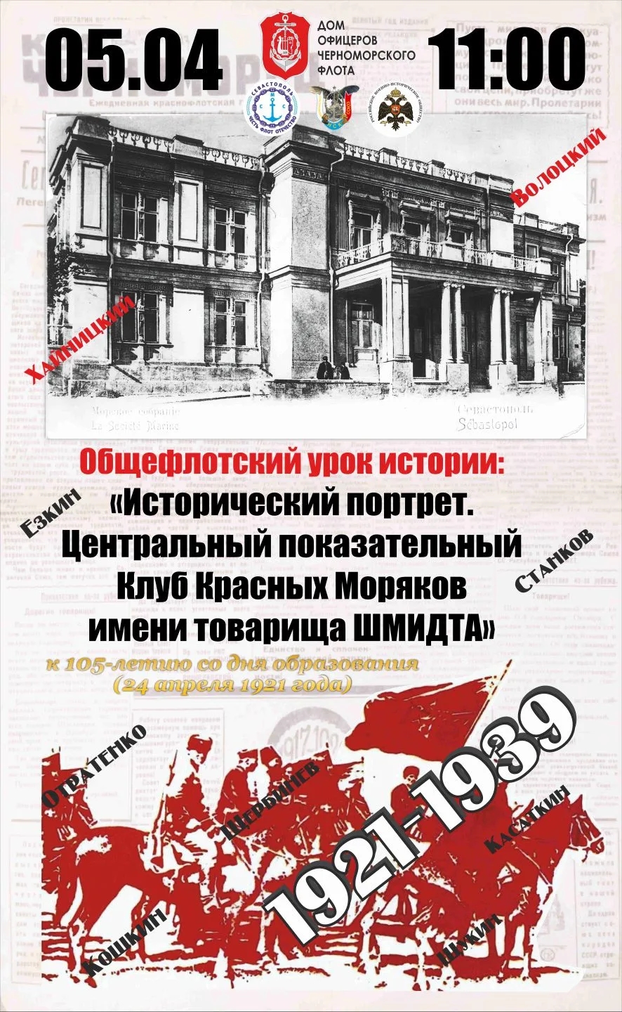 5 апреля 2026 года в 11.00 в зале имени адмирала Ф.Ф. Ушакова Севастопольского Дома офицеров Черноморского флота состоялся первый общефлотский урок истории "Исторический портрет. Центральный показательный Клуб Красных Моряков имени товарища Шмидта", приуроченный к 105-летию Севастопольского Дома офицеров.