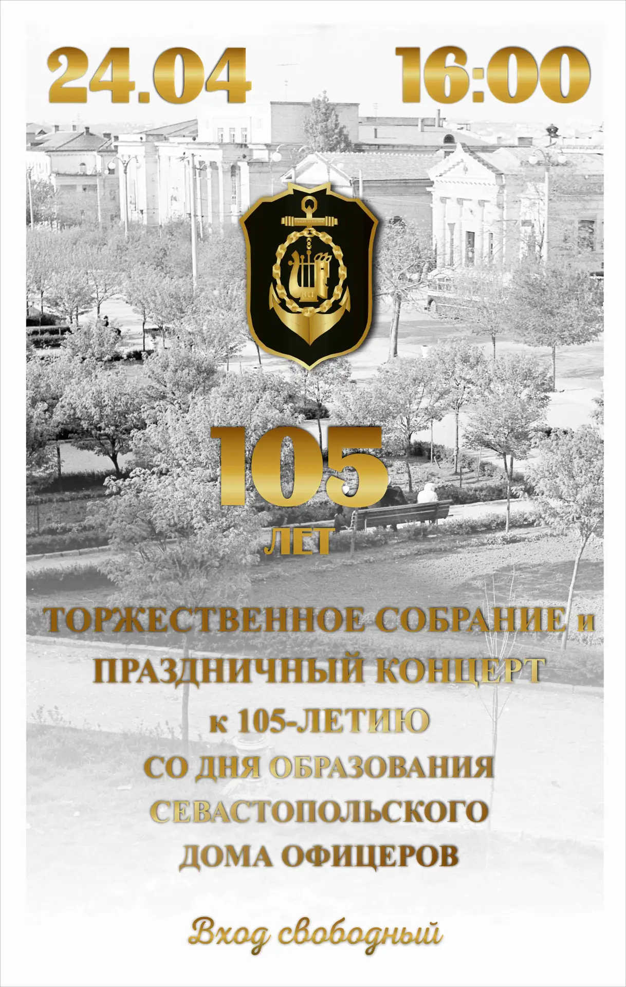 24 апреля в 16.00 состоится торжественное собрание и праздничный концерт к 105-летию Севастопольского Дома офицеров. Вход свободный.